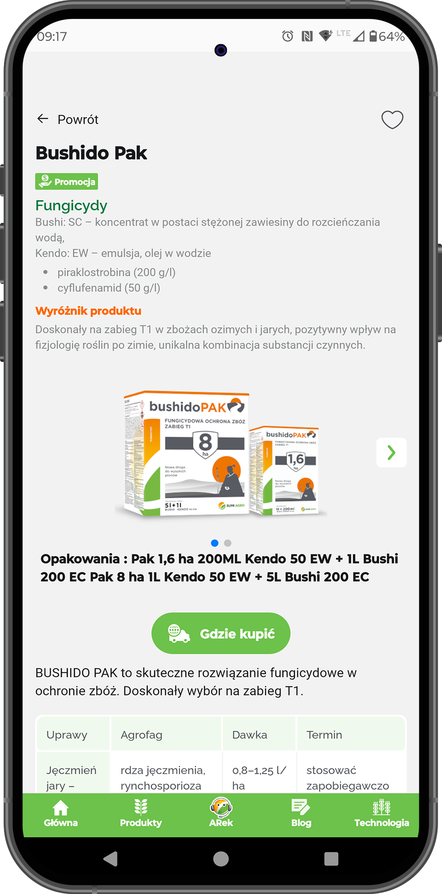 Tak. Aplikacja zawiera katalog produktów i rekomendacje dopasowane do bieżących zagrożeń – od fungicydów interwencyjnych po insektycydy i herbicydy.