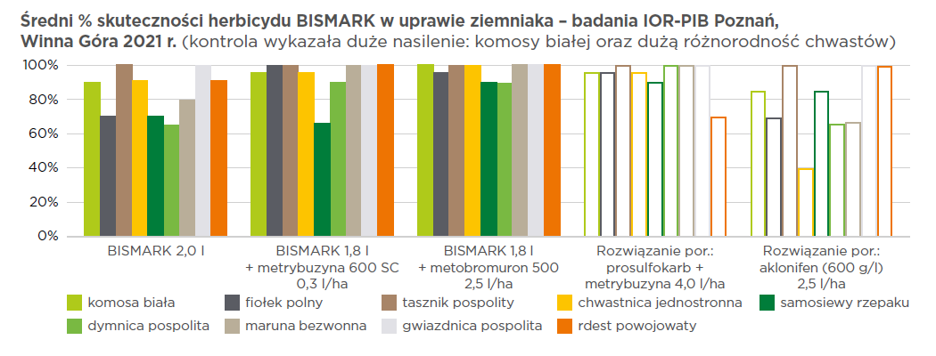 Aplikacja preparatu BISMARK (1,8 l/ha) w połączeniu z metobromuronem wykazała bardzo wysoką skuteczność chwastobójczą. W zwalczaniu komosy białej, chwastnicy jednostronnej, maruny bezwonnej oraz rdestu powojowego BISMARK wypadł świetnie. Z kolei doświadczenia z Uniwersytetu Przyrodniczego w Poznaniu potwierdziły doskonałe działanie preparatu BISMARK na polach z ekstremalnym nasileniem chwastnicy jednostronnej.